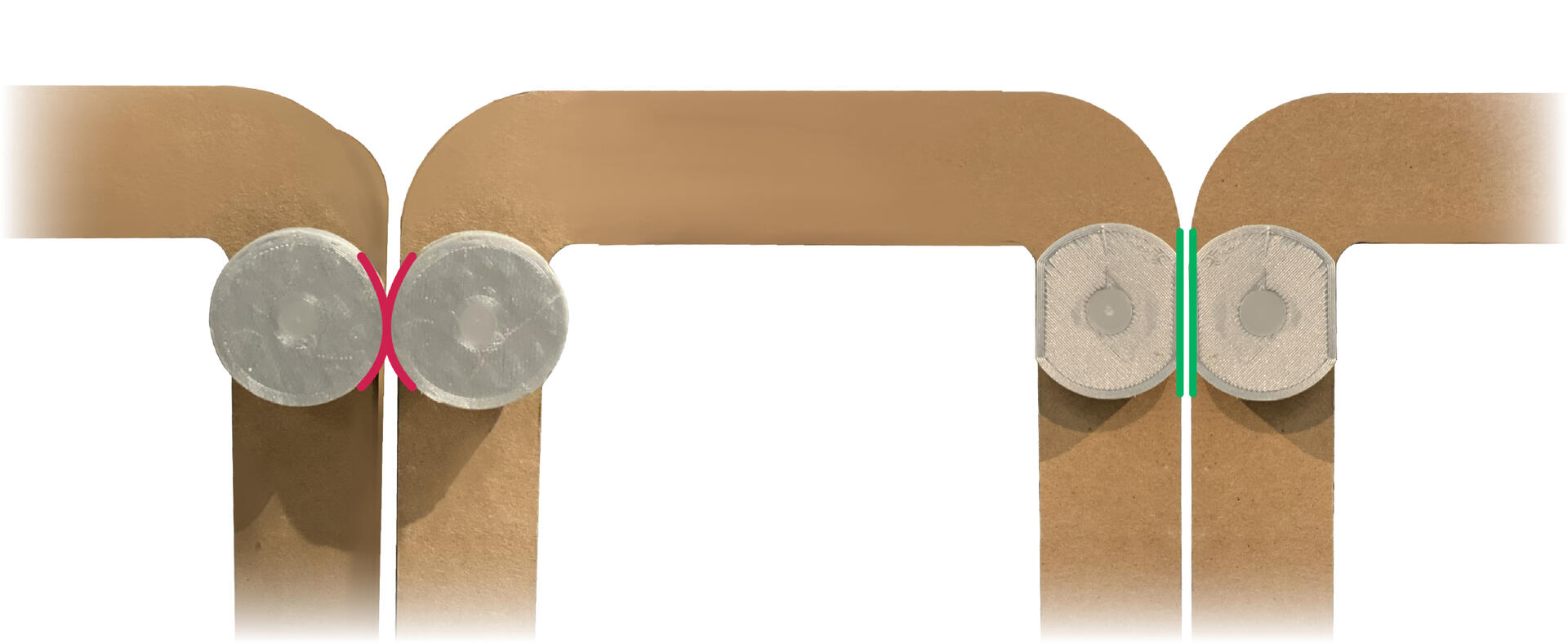 As development continued, it was soon recognized that rounded pins worked well but were too large in diameter, and caused collision when placed next to other units!In order to resolve this collision, it was essential to make the pins flattened, to match with the module's edges.